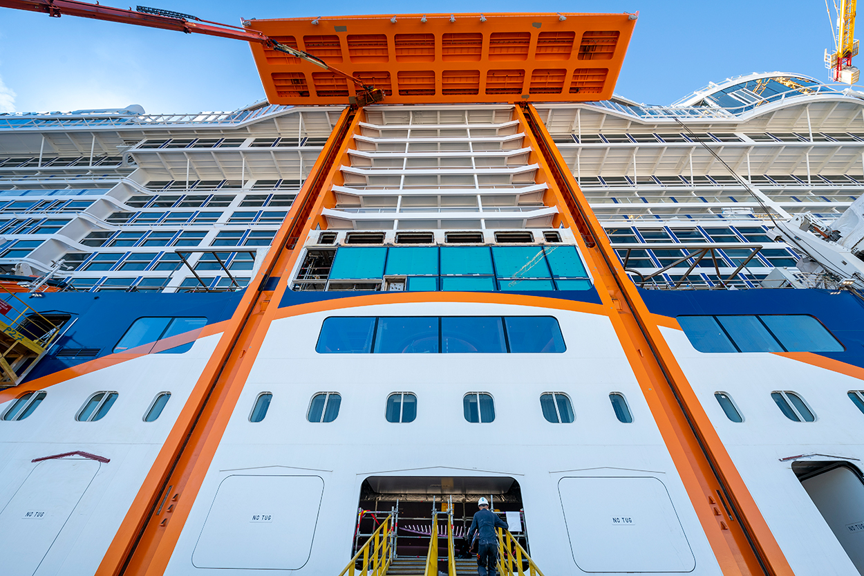 Immediately following the Celebrity Edge check-signing and delivery ceremony, attendees made their way across the Chantiers de l’Atlantique shipyard for the ceremonial keel laying of Celebrity Apex, sister ship to Celebrity Edge, where a 762-ton block was lifted in the air and a lucky coin was placed on the dock before the block was lowered into position.