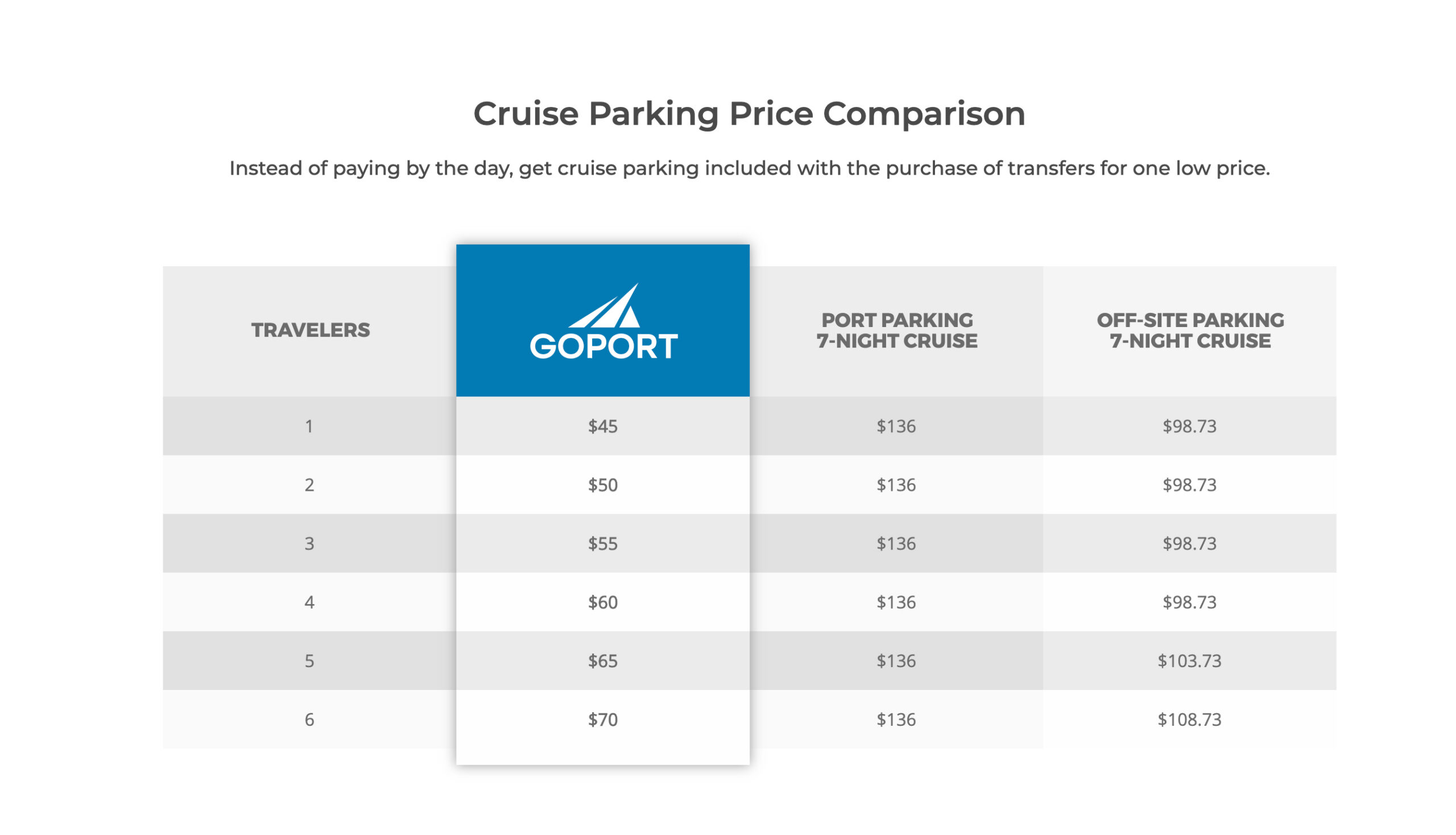 A shared shuttle service is the easiest and most practical way to get to your terminal. Besides saving money, you can avoid waiting in long lines for car rentals, taxis, and ride sharing services that charge peak rates for this in-demand time. GoPort.com is the leader in airport to cruise port shared shuttle transportation — known for their award-winning service that costs less than half the price of the cruise lines’. Simply book your ride ahead of time and GoPort will take care of the rest. When you arrive at the airport, you’ll just check in at their counter. In no time, you’ll be enjoying a relaxing ride to your terminal entrance.