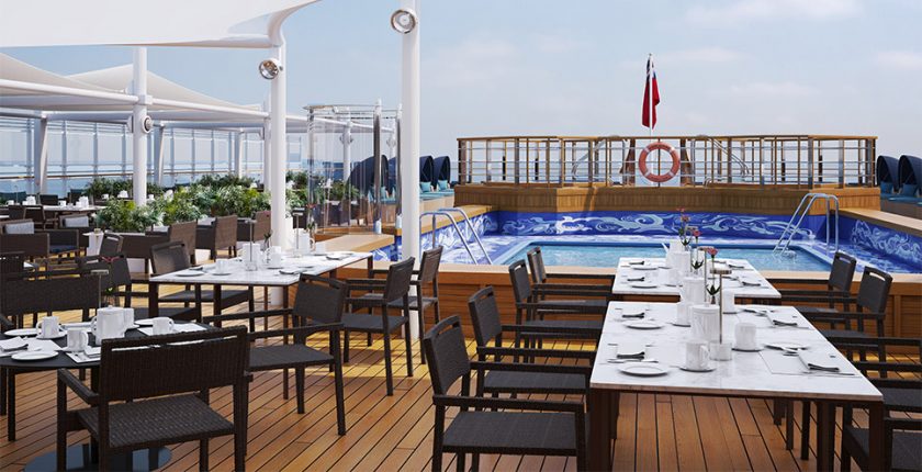 One of the most ambitious parts of the Queen Victoria refit was the upgrade to the Lido Sun Deck. There are so many satisfying spaces on board a Cunard ship. During the refit of Queen Victoria, her service offering has been brought in line with that of the rest of the fleet and her popular aft lido sun deck has been expanded. The new design maximizes and transforms her aft deck space to create a stunning contemporary mix of sun and shade, more akin to a luxury resort roof terrace – perfect for sailing around the Mediterranean. Guests are now able to enjoy more generous seating, enhanced deck furniture, extended shaded areas, al fresco dining options and a full beverage service throughout the day and into the evening, with live entertainment.