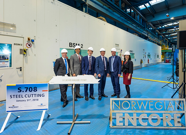 At the Meyer Werft shipyard in Papenburg, Germany, executives from both companies gathered to watch them cut the first plate of steel, marking the ceremonial start of construction of Norwegian Encore, which is due for delivery on October 31, 2019.
