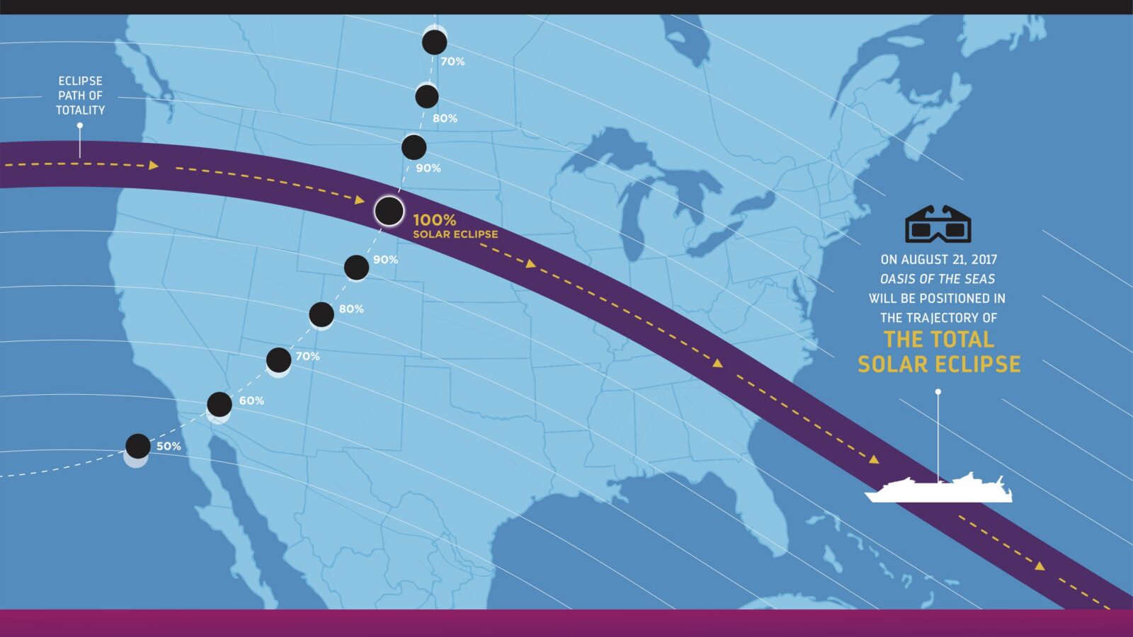 The video below show how Royal Caribbean’s Chief Meteorologist James Van Fleet and Oasis of the Seas Captain Per Kristoffersen collaborate to navigate toward the path of totality for the Great American Eclipse – and skill required to navigate the ship with precision.