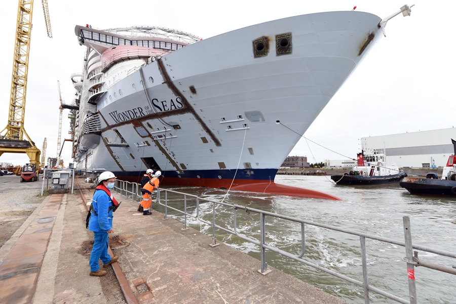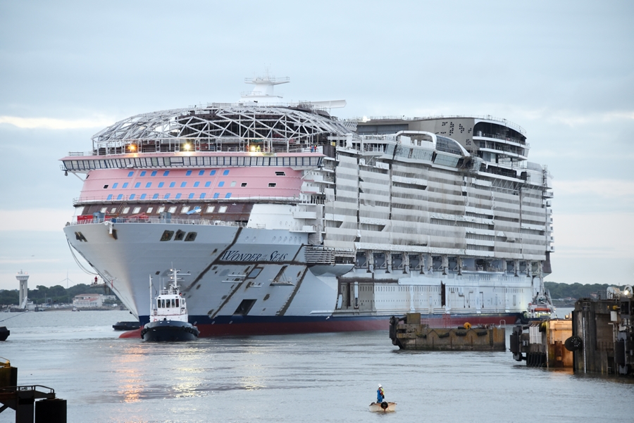 Royal Caribbean’s fifth Oasis-class ship, Wonder of the Seas, has been transferred to the fitting out dock at Chantiers de l’Atlantique shipyard in Saint-Nazaire, France. This was also the first time the ship’s hull has touched water since construction began with the first block being placed in October 2019.